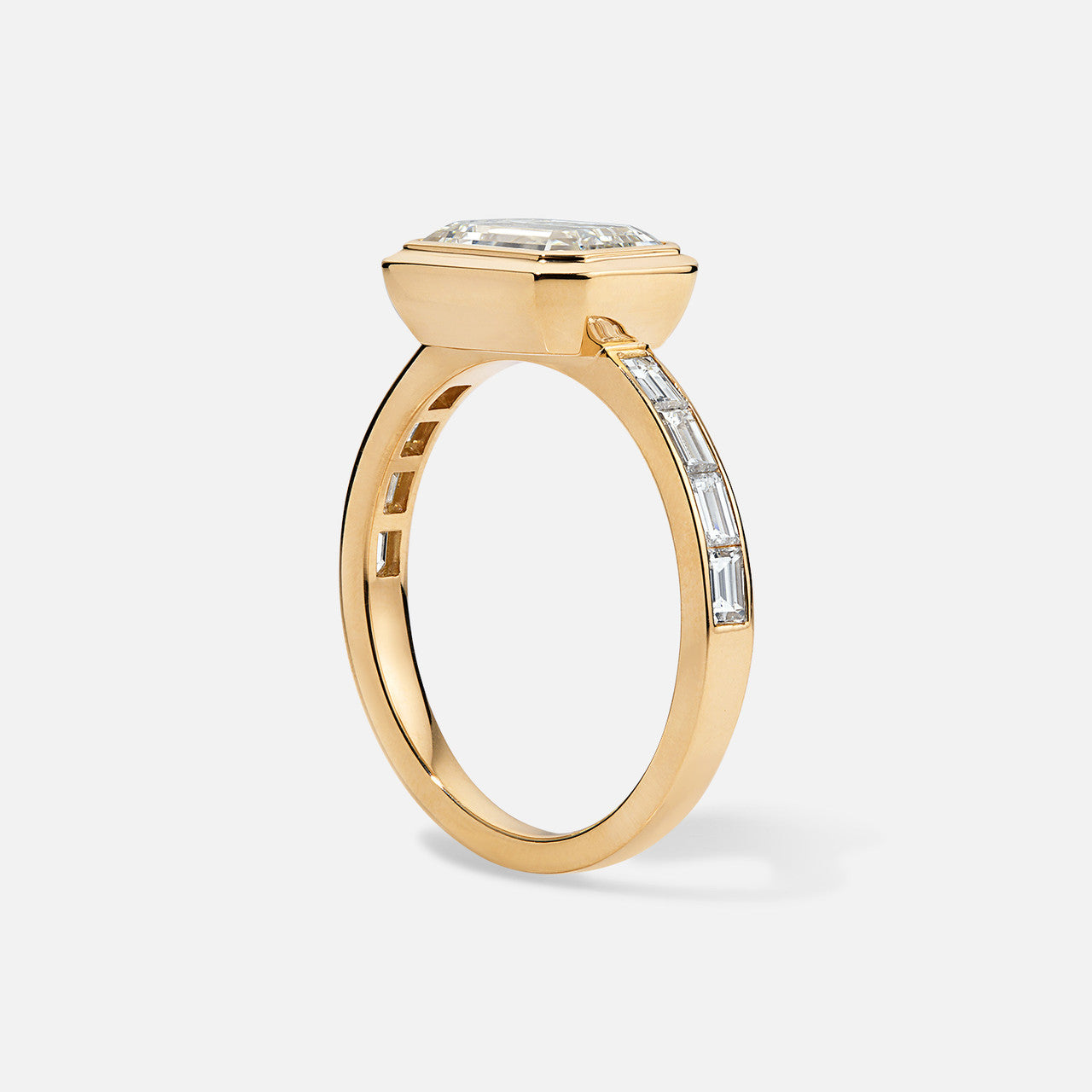 Learn moreThis 18k yellow gold semi-mount features eight emerald-cut diamonds and holds an emerald-cut center diamond, which is sold separately.