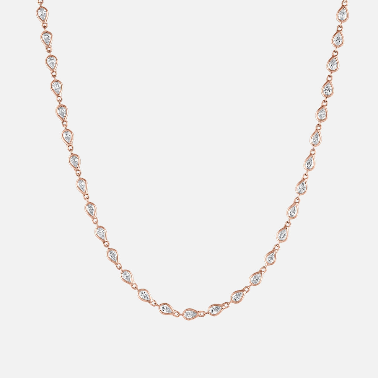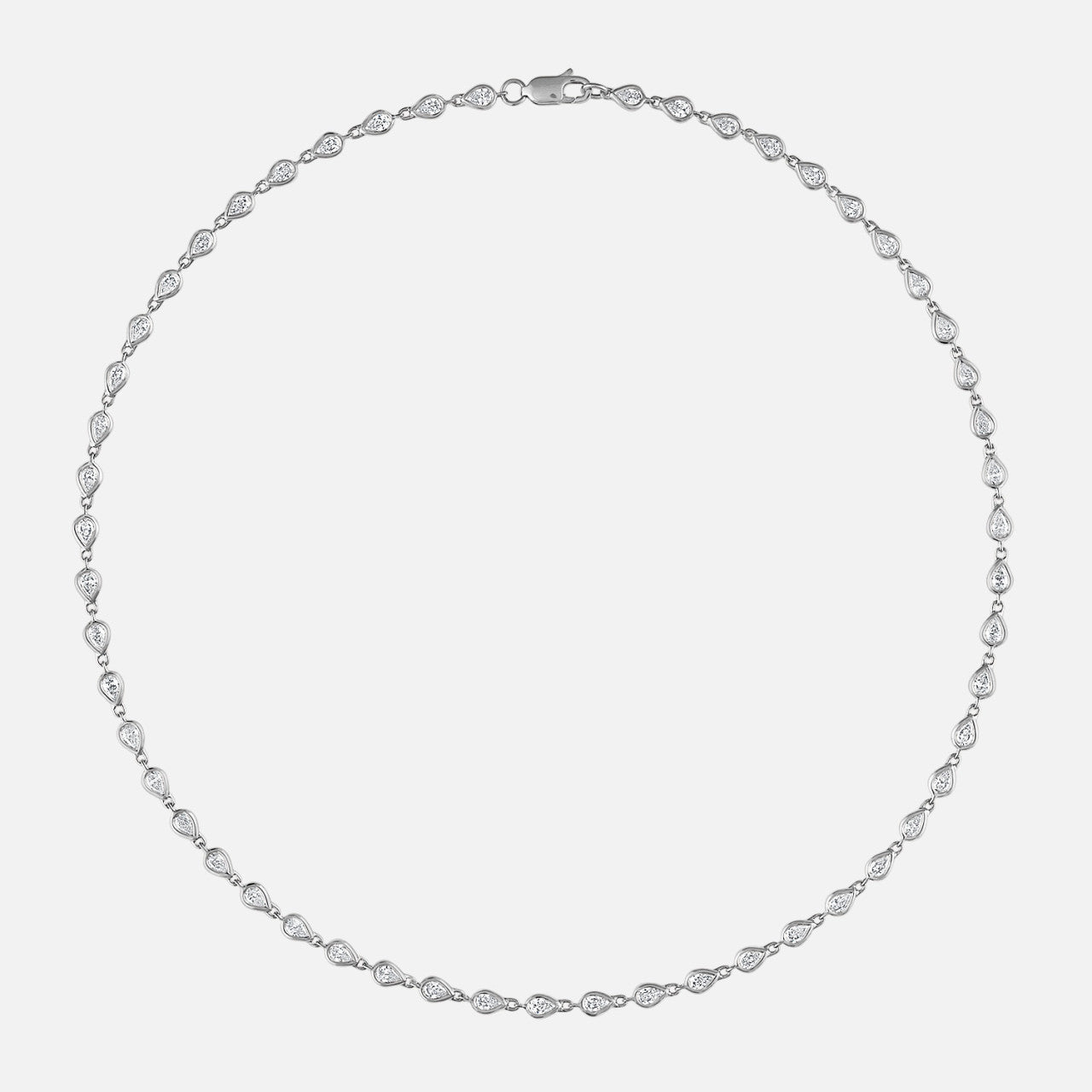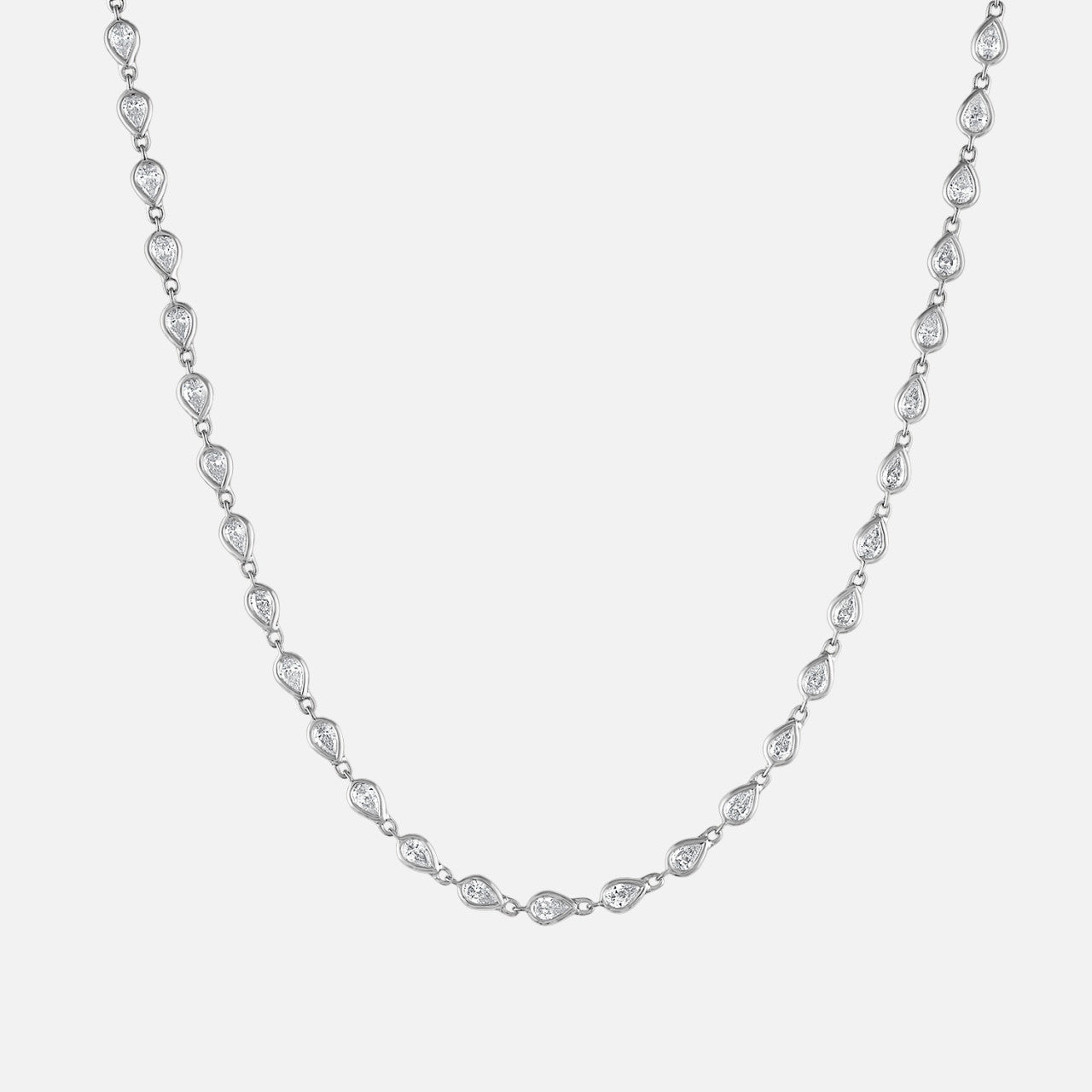This diamond tennis necklace stands out for its 53 pear-shaped diamonds in bezel settings.