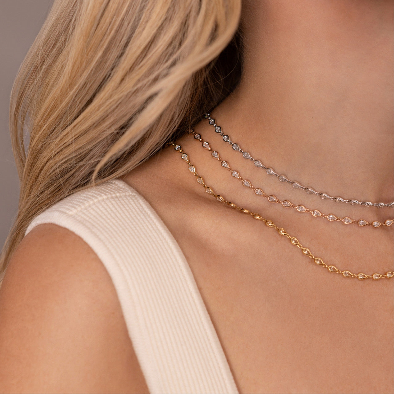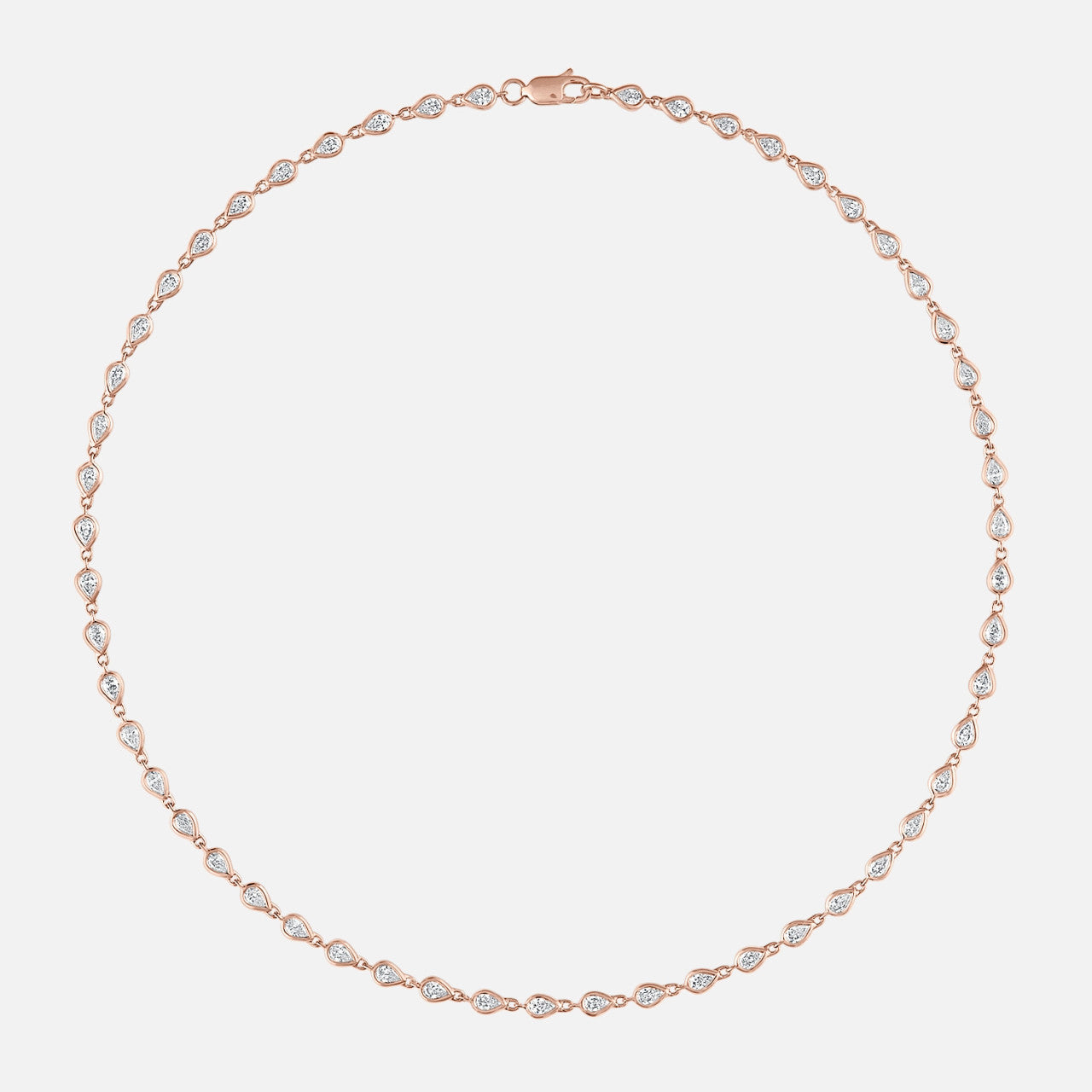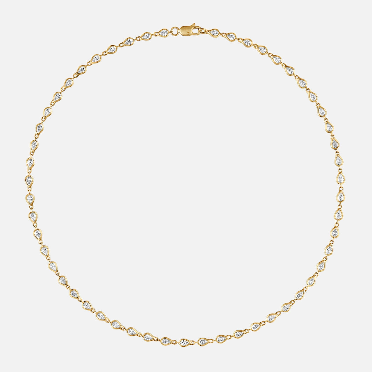 This diamond tennis necklace stands out for its 53 pear-shaped diamonds in bezel settings.