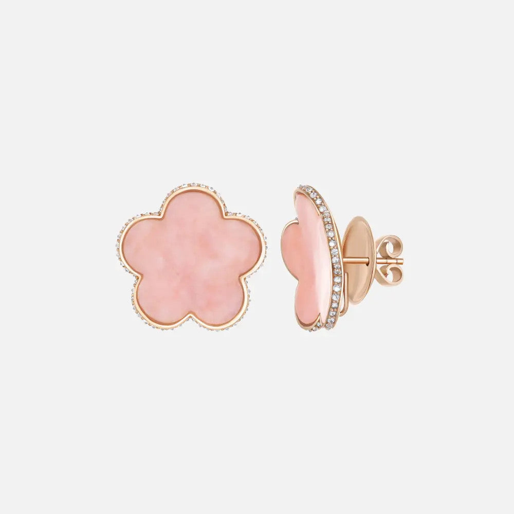 These earrings feature carved pink opals in a flower motif, surrounded by round diamonds.