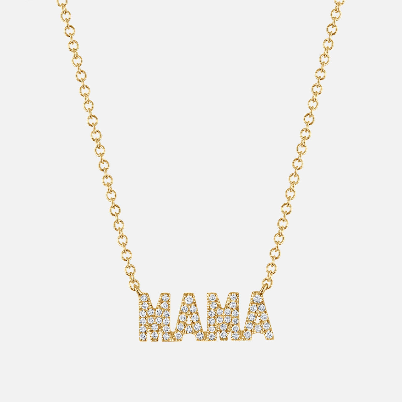 This gold necklace features a central pendant that spells "MAMA" adorned with 56 round natural diamonds.