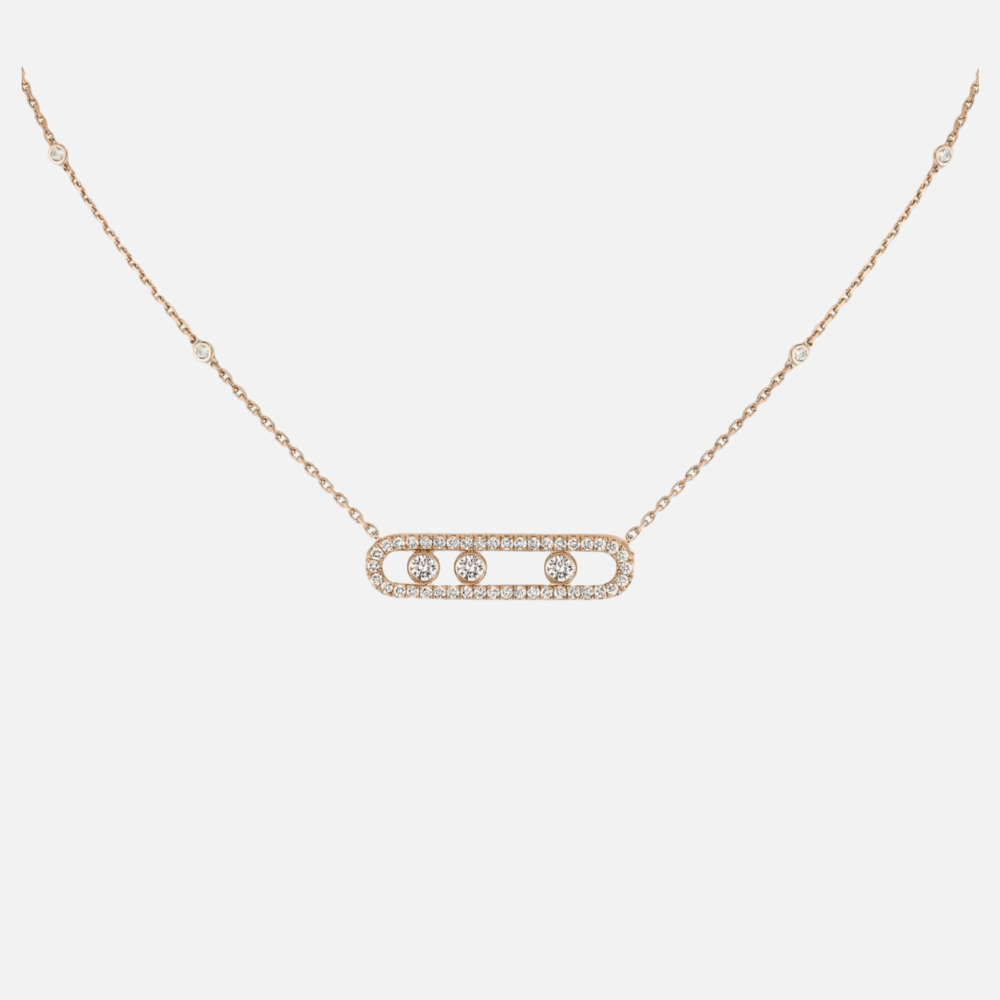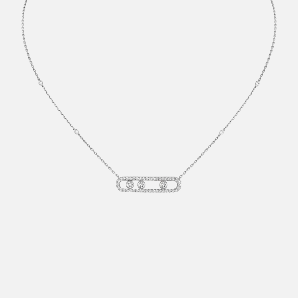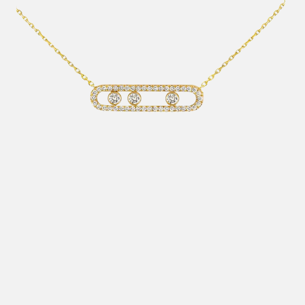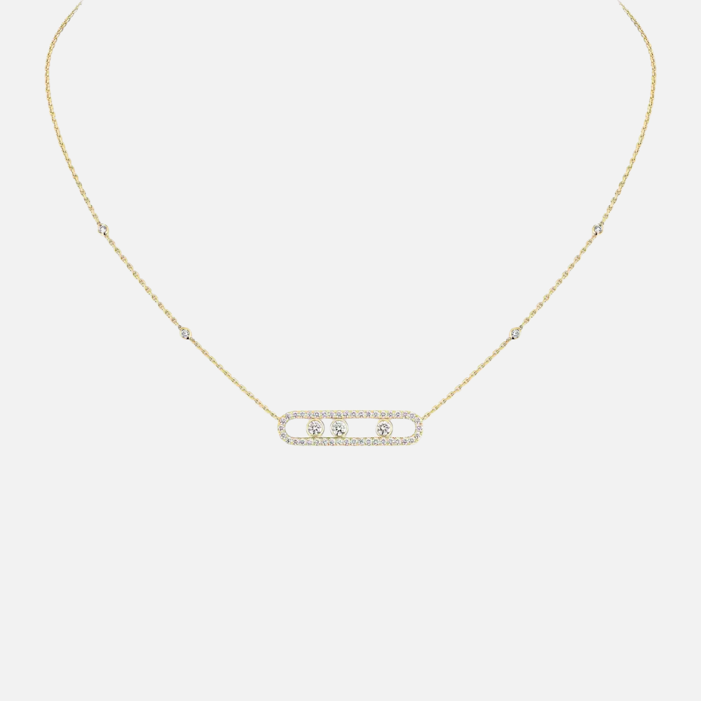 Learn moreThis handcrafted 18k gold necklace, part of the Move collection, showcase three moving brilliant-cut diamonds in the the center, surrounded by pavé diamonds as well as accent diamonds on the chain, for a total of 51 round natural diamonds.