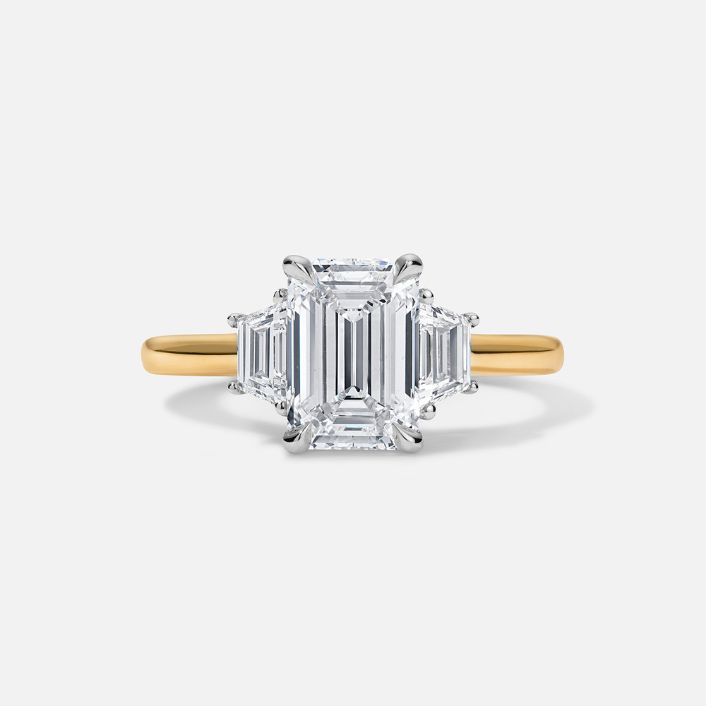 This 18k yellow and white gold semi-mount features two trapezoid diamond side stones to complement a center emerald-cut diamond, which is sold separately.