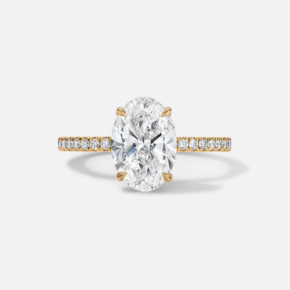 This 18k yellow gold engagement ring semi-mount features 48 round natural diamonds along the band to complement the center oval diamond, which is sold separately.