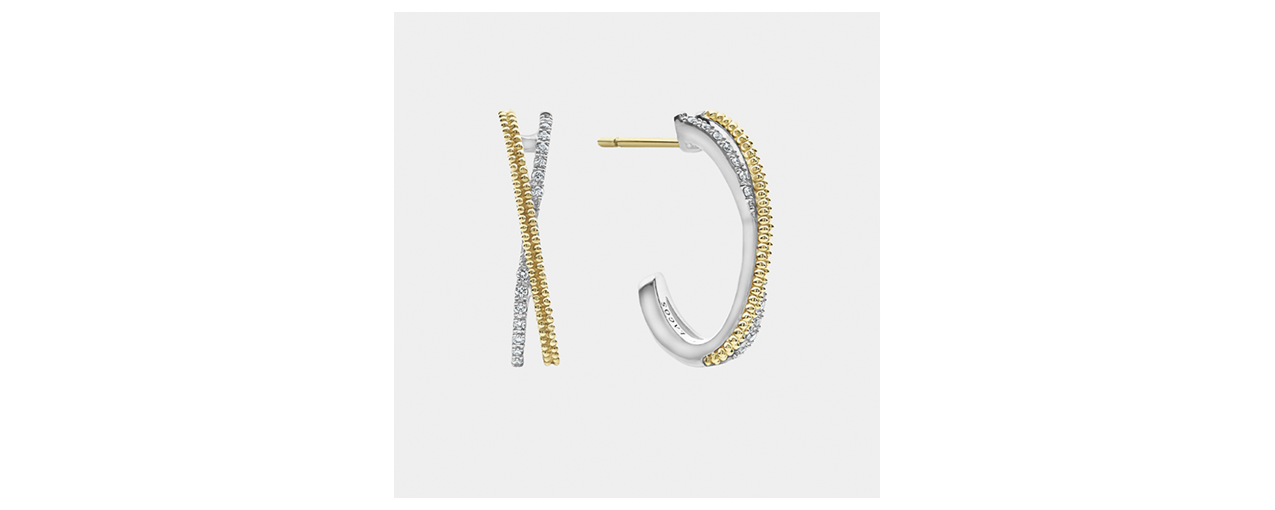 Lagos Caviar Lux Thin Two-Tone Caviar X Diamond Hoops: These diamond hoop earrings combine 18k gold Caviar beading and sterling silver in a classic X shape.