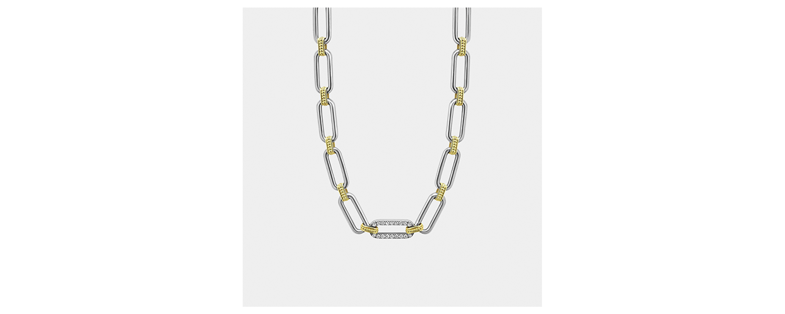 Lagos Signature Caviar Two-Tone Link Single Station Diamond Necklace: Featuring 18k yellow gold on a sterling silver link chain and 0.46 carats of diamonds, this necklace layers well with both white and yellow gold chains.