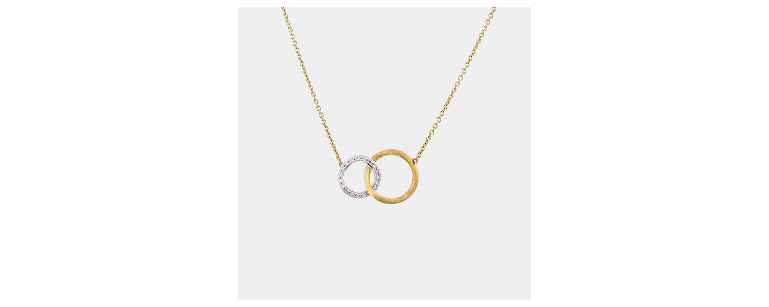 Marco Bicego Jaipur 18K Yellow & White Gold Mixed Link Diamond Pavé Pendant: This two-tone necklace features interlocking circles in 18K yellow and white gold, accented with brilliant round diamonds, making it a versatile layering necklace.
