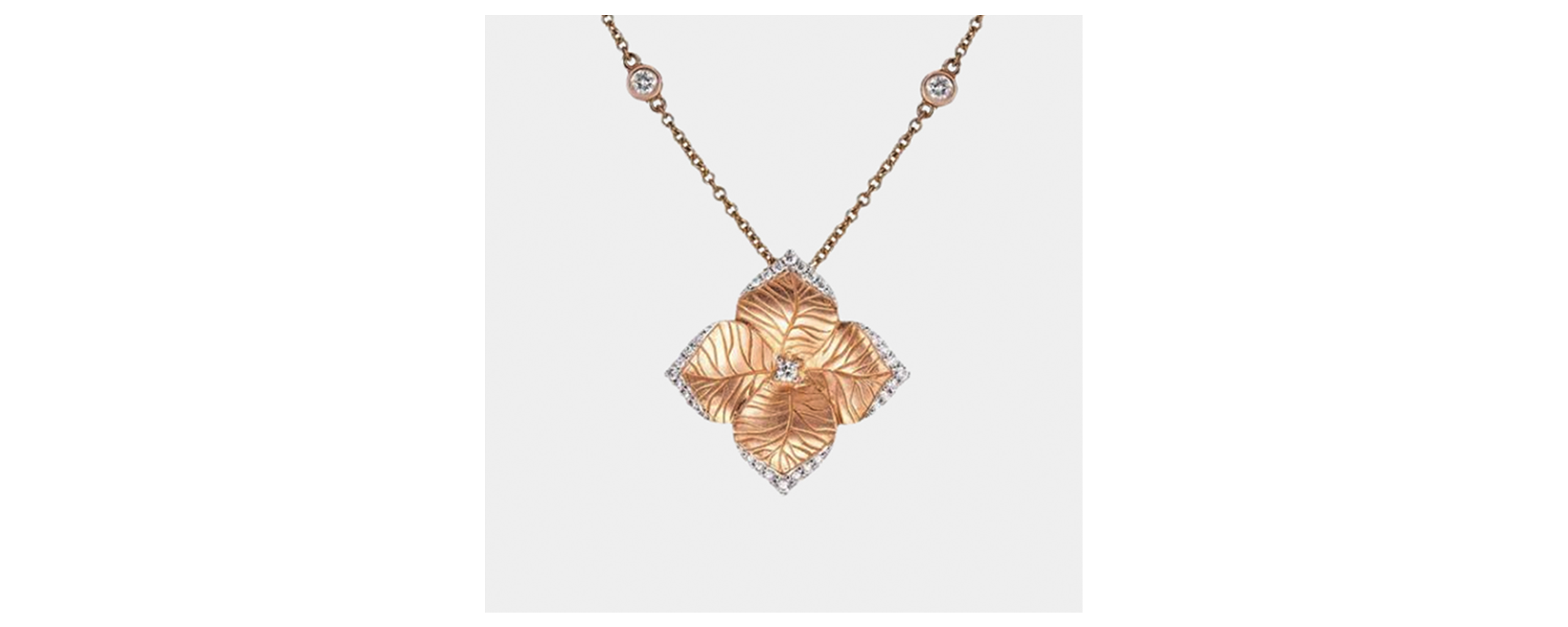 Piranesi Fiore Small Rose and White Gold Flower Necklace: This flower pendant necklace mixes white and rose gold with a satin finish, making it a versatile mixed-metal piece that effortlessly connects different jewelry tones and metals in your collection. Set with 21 round diamonds on the petals and the center, it adds subtle sparkle and a touch of warmth to any look.