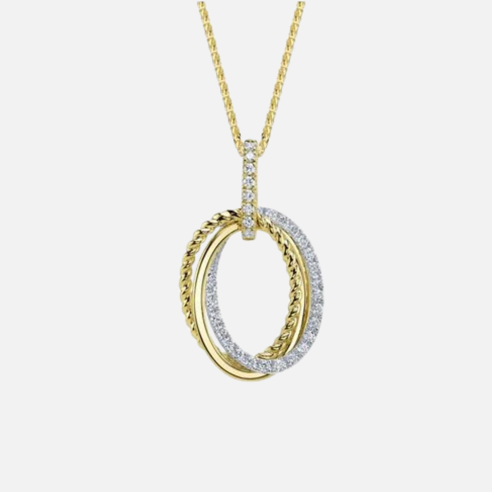 This two-tone 14k yellow and white gold necklace features three ovals and a total of 37 round diamonds.