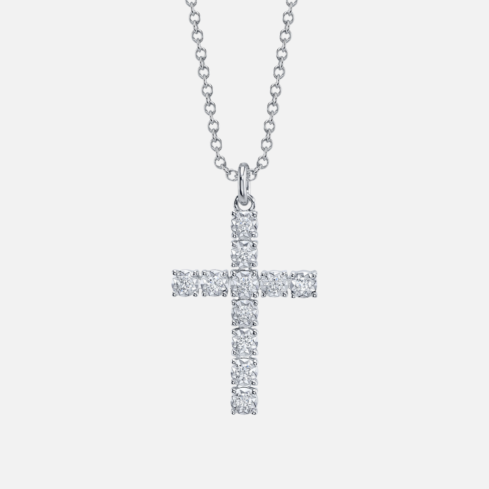 This 14k white gold necklace features a cross with 11 round diamonds.