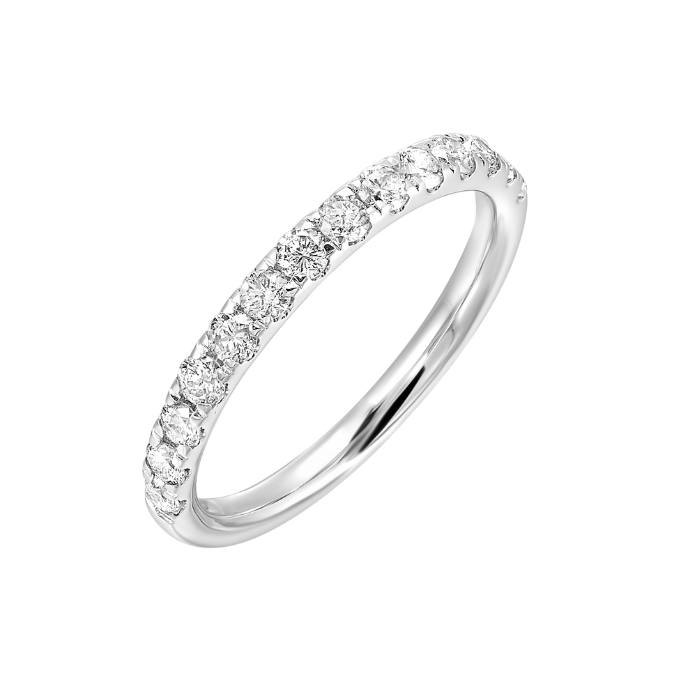 This 14k white gold halfway band features 14 round natural diamonds.