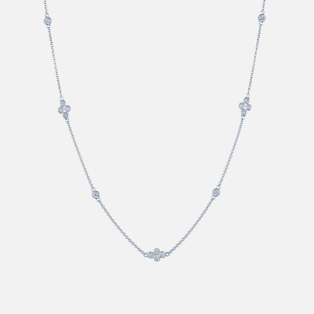 Showcasing a total of 24 diamonds, this necklace features a fluid strand design with alternating clusters of four diamonds and single stones.