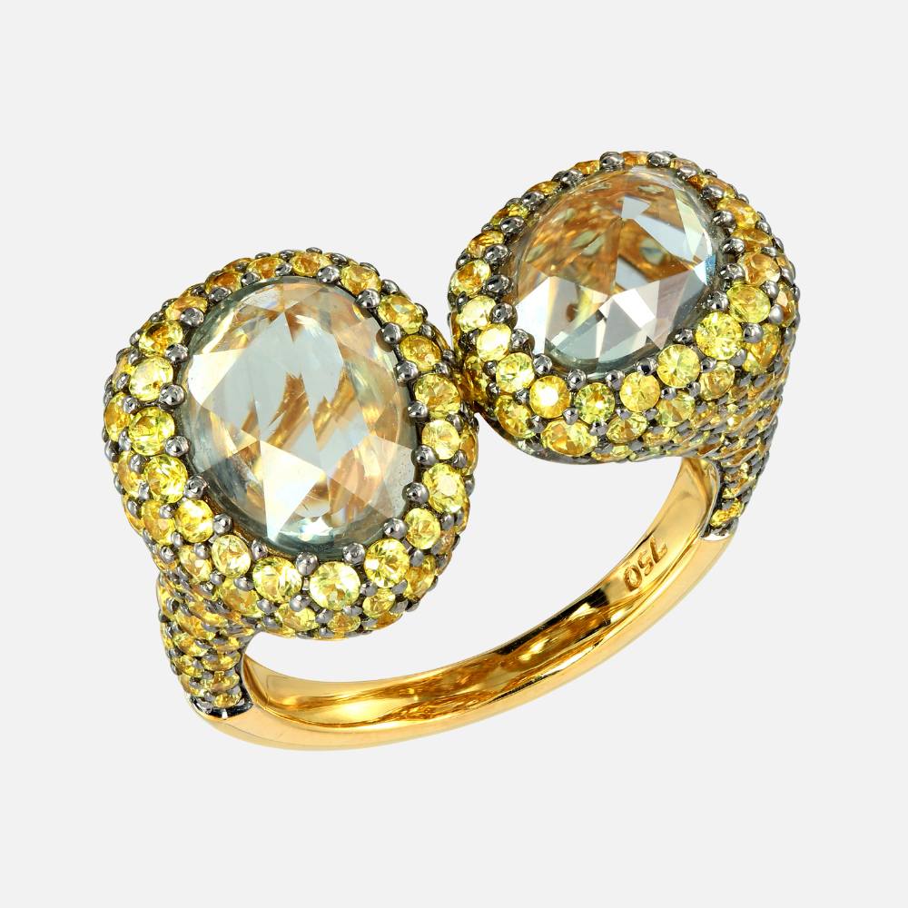 This 18K yellow gold ring features two prominent oval rose-cut green sapphires totaling 4.15 carats. The design is accented with 3.64 carats of round yellow-green sapphires.