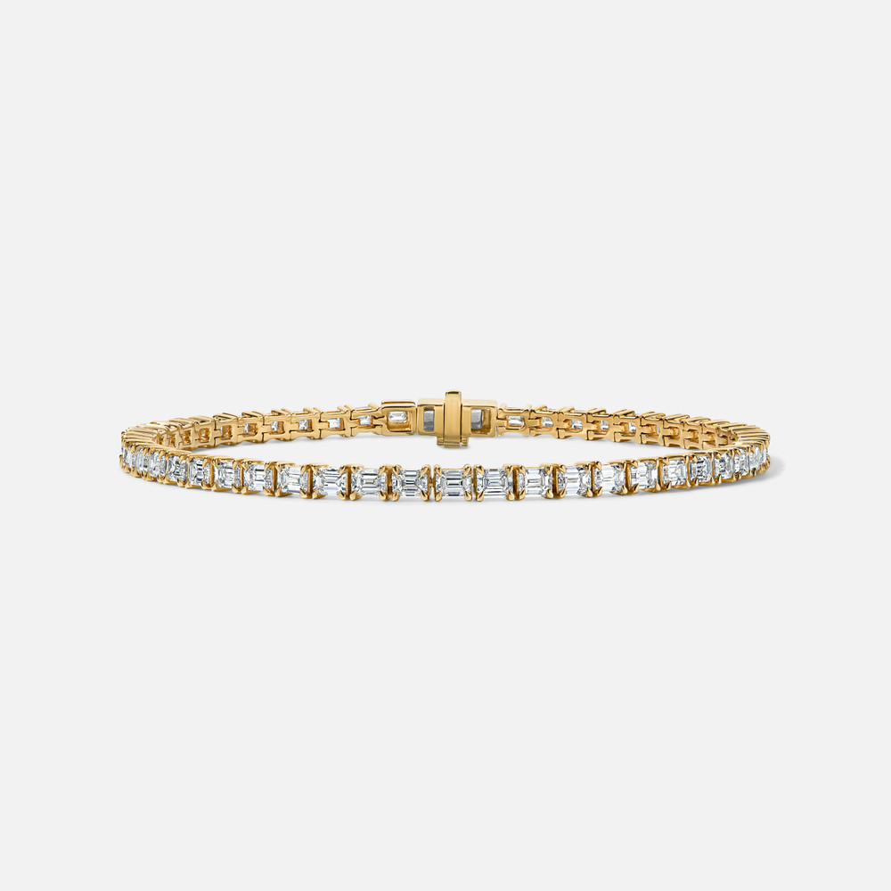 This tennis bracelet features 52 emerald-cut natural diamonds set in 18k yellow gold.