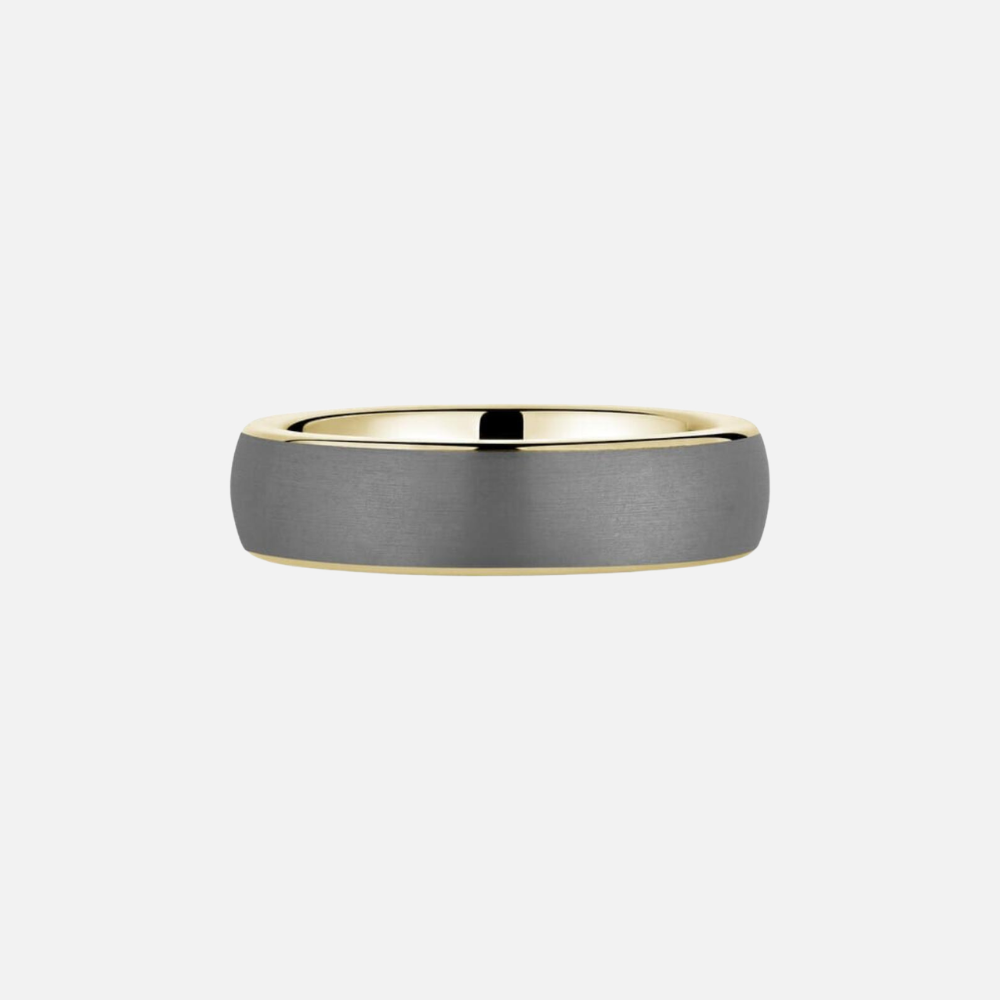 Grey tantalum accented with 14k yellow or white gold inlay, featuring a sandpaper-textured center framed by high-polish edges.