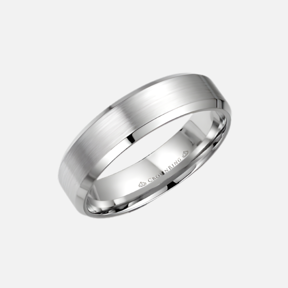 This grey palladium band features a 6mm profile with a sandpaper-textured center and high-polish edges.