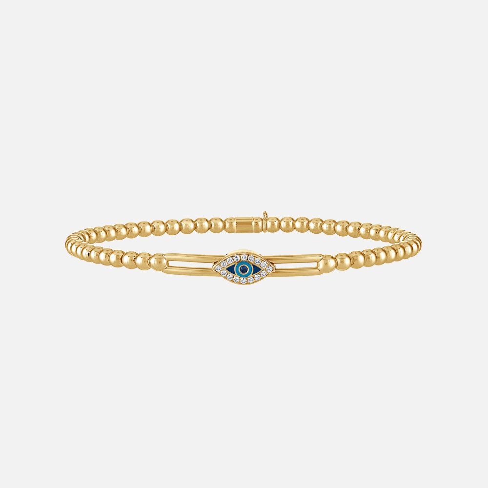 This dainty 18K yellow gold stretch bracelet features a petite blue sapphire eye accented by 16 round diamonds.