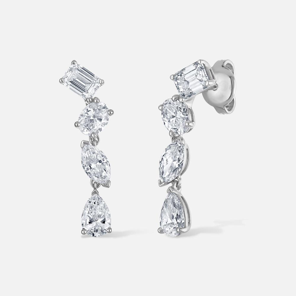 Each earring in this pair contains an oval-, emerald-, marquise- and pear-shaped diamond.