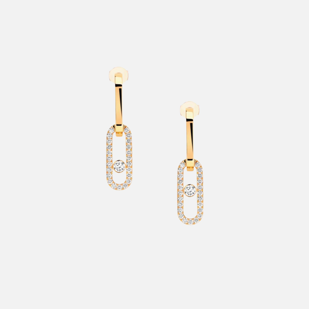 These 18k solid gold earrings from the Move Link collection feature the signature moving diamond in the center of a diamond-set link. The pair showcases a total of 50 round diamonds.