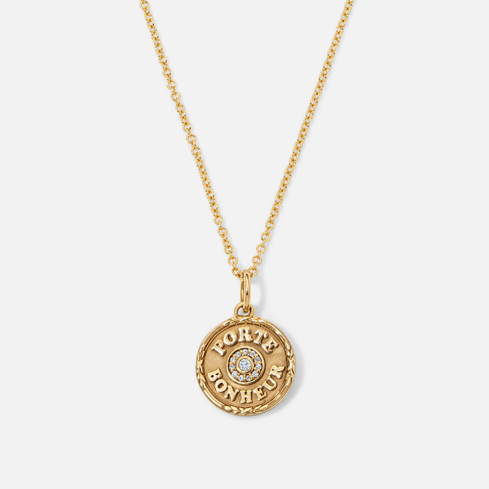 This 18k yellow gold pendant features 12 round natural diamonds and text, "Porte Bonheur." The chain is sold separately.